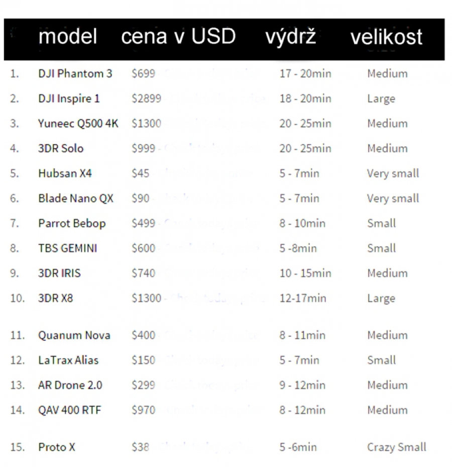 Kritéria hodnocení, která server použil sice nejsou moc jasná, takže jde do značné míry o subjektivní názor, přesto má svou cenu. Jednak se v mnoha ohledech shoduje s jinými takovými tabulkami, jednak - na rozdíl od propracovanějších hodnocení - přináší celkový pohled a přehledný průřez hlavními kategoriemi dronů pro rekreační a poloprofesionální létání. Dává tak dobrou představu o tom, jak to na současném trhu drony vypadá a kam směřuje.