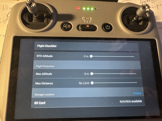 Teď konečně máte k dispozici spuštěný ovladač. Podrobně se mu budeme věnovat v některém z dalších dílů recenze, teď před prvním startem si ale musíme všimnout alespoň obrazovky základního nastavení. Dostanete se na ní klepnutím na tři tečky v pravém horním rohu obrazovky. Z pěti nabídek nahoře (Safety, Control, Camera, Transmission, About) vybereme Safety a nastavíme výšku případného automatického návratu (RTH) a maximální vzdálenost letu. S maximální výškou letu 120 metrů zatím bohužel nic nenaděláme, víc si o tom povíme v některém pokračování.